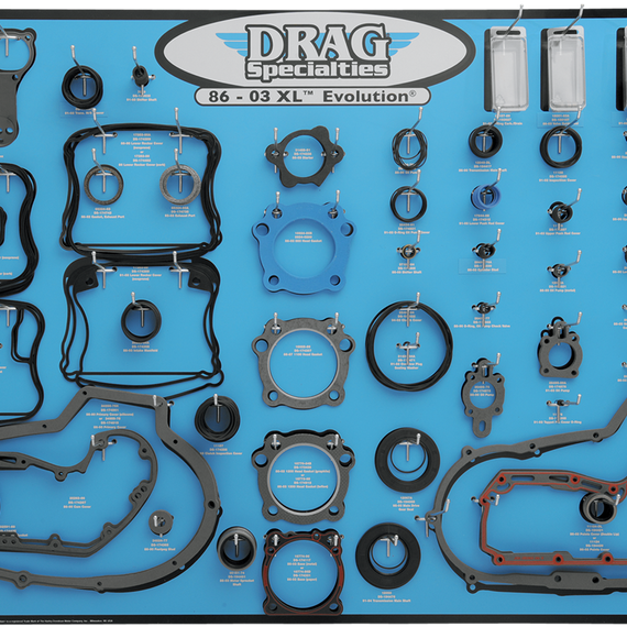 Caracteristicas: Complete four-color display features gaskets, seals and O-rings necessary to rebuild most XL Evolution motors Mounts easily on any 1/8" or 1/4" peg board Designed so that three 32" H x 48" W displays will fit on a single sheet of 4' x 8' pegboard Gaskets, seals and O-rings are not included; a list is furnished to allow you to stock the products that you require Made in the U.S.A.