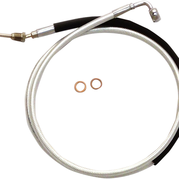Caracteristicas: Constructed with PTFE inner tubing, DuPont Kevlar aramid fiber, premium Signature Magnum braids and an outer PVC jacket Three unique stainless steel transmission fittings eliminate the use of adapters Braid color and weave match all other Magnum control cables and brake lines Crystal clear outer jacket offers exceptional protection against scuffing the bike's paint or chrome and will never discolor Inner PTFE tubing braided with aramid fiber provides the ultimate in high performance and is compatible with all hydraulic fluids Transmission fittings for all hydraulic clutch lines have a natural stainless steel finish Compliant with all DOT FMVSS-106 Specifications Assembled in the U.S.A. 99-12 OE Harley, CVO, P&A and 02-17 V-Rod hydraulic clutch line fittings require taking a measurement to determine ordering length
