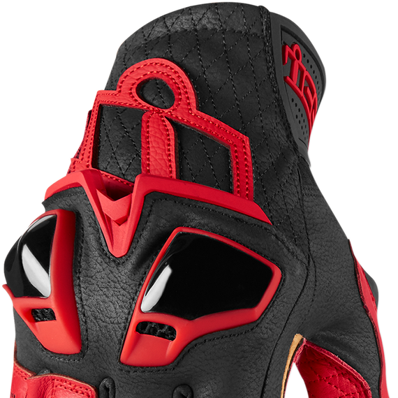 Caracteristicas: French cowhide backhand is supple, strong, and provides excellent comfort and flexibility Kangaroo palm - a hallmark of purpose-built track gloves - provides optimum abrasion resistance and dexterity Panels of digital Battlehide™ goatskin are used in areas of high wear from grips Mechanical articulation panels, which run the length of each finger, provide excellent flexibility from the very first time you wear the gloves ICON's exclusive floating knuckle allows for maximum knuckle articulation, and an out-seamed finger box for all day comfort