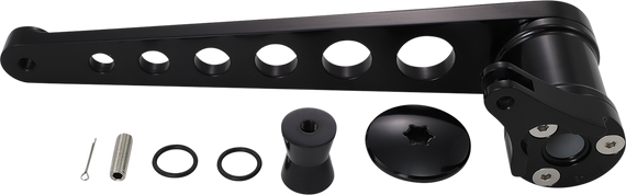 Caracteristicas: Perfectly complements the Bagger Nation E-Beam Shift Lever and Stealth Heel Shift Lever Made from a solid piece of 6061-T6 billet aluminum Accepts Bagger Nation, OEM and most popular toe peg styles Spacer is included for optional extended peg reach Fully adjustable peg position when extended reach is desired