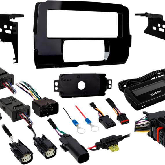 Caracteristicas: ISO DIN radio provision Axxess interface in water resistant enclosure included AXSWC in water resistant enclosure included for installations adding OEM handlebar audio controls Antenna included Made from molded ASA plastic Includes wiring harness Water-resistant