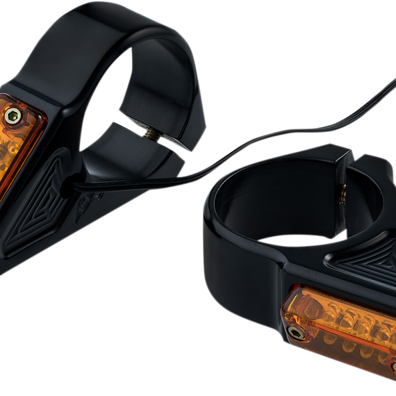 Caracteristicas: CNC-machined from solid blocks of 6061-T6 billet aluminum Pitch bolt mounting design for a clean look Can be mounted either inward or outward from the fork tubes Super-bright amber LED lights 1½" wide, ½" tall; lights are set at a 25° degree angle for standard HD forks 2½" wide from center of fork tube to the end of the light Made in the U.S.A.