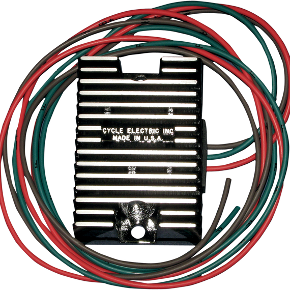 Caracteristicas: Control voltage on Harley-Davidson alternators, unlike other rectifiers or regulators that dump to ground and cause maximum stator current and higher temperatures Cycle Electric rectifying regulators block current to control voltage; this reduces stator current, resulting in low temperature and less drag on the motor, which means more efficient operation A lower-voltage style is available to lower the heat level in the battery where battery is enclosed in center of oil tank Made in the U.S.A.