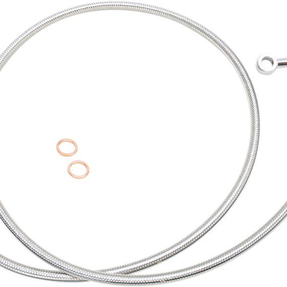 Caracteristicas: Manufactured with an enhanced construction designed to be compatible with Harley-Davidson® ABS requirements for stock and alternate length brake lines Brake kits consist of a direct fit lower assembly used in conjunction with alternative length upper lines AN-3 connections make for easy installations Braid color and weave match all Magnum control cables and brake lines Crystal clear outer jacket offers exceptional protection against scuffing paint or chrome and will never discolor Inner PTFE tubing braided with Aramid Fiber reinforcement provides the ultimate in high performance by greatly reducing line expansion Brake lines are constructed with PTFE inner tubing, DuPont™ Kevlar® aramid fiber, premium signature magnum braids and an outer PVC jacket Compliant with all DOT FMVSS-106 specifications Assembled in the U.S.A.