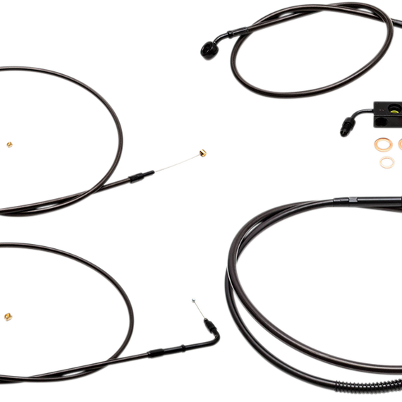 Caracteristicas: Standard kits include clutch line, brake lines, black "T" brake line junction, banjo bolts, fittings and copper crush washers Standard kits include the correct length brake/clutch lines and wire extensions to complete a handlebar swap Electrical wire extensions NOT included (available separately) Midnight series kits include clutch line and brake lines covered in a black smoke tinted coating with pure black fittings throughout Lines appear graphite or carbon fiber in appearance providing that ultra custom look and the black fittings seamlessly blend with blacked out controls and covers on the bike Made in the U.S.A. Kits are based on using 2" risers with Ape Hanger handlebars
