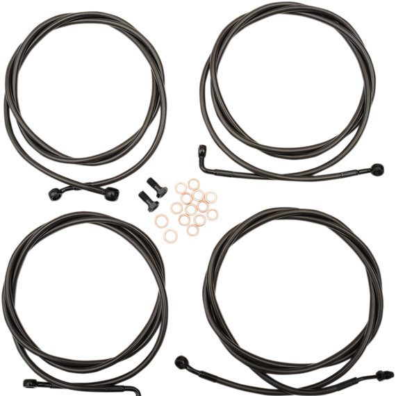 Caracteristicas: Kits include the correct length braided brake/clutch lines and wire extensions to complete a handlebar swap Black "T" brake line junction, banjo bolts, fittings and copper crush washers included Made in the U.S.A. Kits are based on using 2" risers with Ape Hanger handlebars