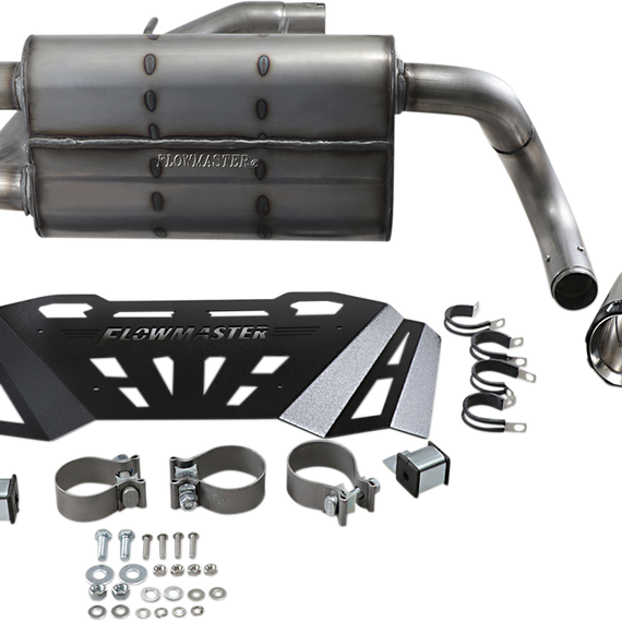 Caracteristicas: 409S stainless steel construction Connects at the factory slip-fit connection and is firmly held in place using the factory rubber mounts The 2.25-inch mandrel-bent inlet tube flows into the XDR "straight-through" Competition cross-flow muffler providing a deep moderate to aggressive sound level The dual 2.25-inch mandrel-bent tailpipes are tucked up high within the rear fenders and are finished off with a pair of 3.50-inch brushed 304s stainless steel tips with black anodized aluminum end caps Comes with a custom black powder coated heat shield with venting to show everyone behind you why you sound so good Includes all hardware and installation instructions Does not include a catalytic converter For Competition use only