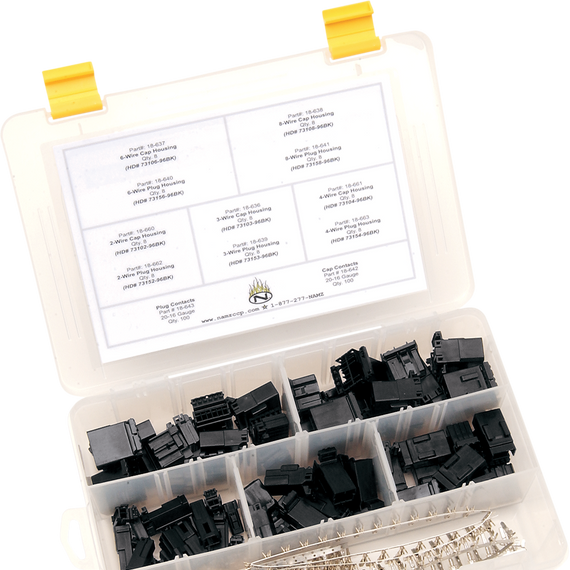 Caracteristicas: AMP Multi-Lock connectors are the direct Harley-Davidson replacements that have been used since 1996 These non-waterproof connectors are used on every factory model Includes all necessary wire seals, wedgelocks and crimp terminals Includes eight 8-position plugs, eight 6-position plugs, eight 4-position plugs, eight 3-position plugs, eight 2-position plugs and 100 terminals for plugs and caps Crimp terminals are sold separately Made in the U.S.A.