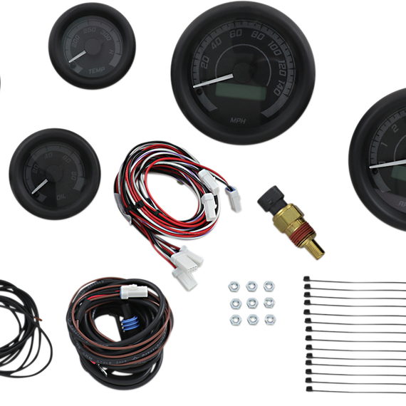 • Six-gauge kits include speedometer, tachometer, oil pressure, oil temperature, fuel level, and voltmeter