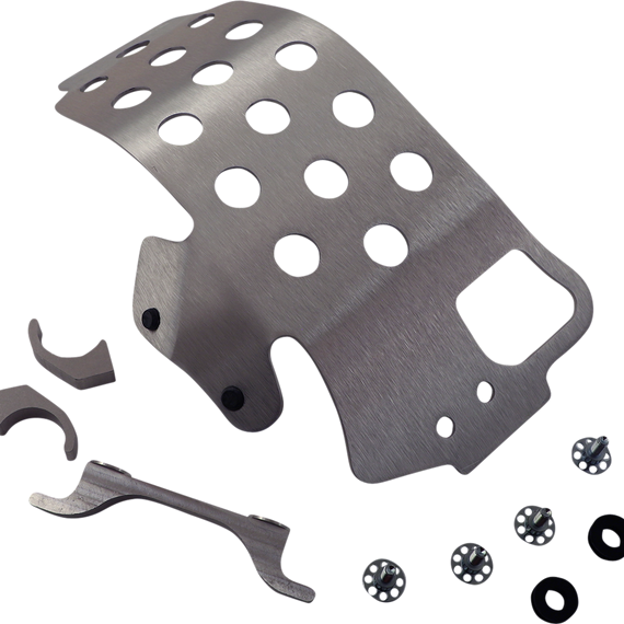 Caracteristicas: CNC-machined from aircraft-grade 6061 T-6 aluminum Specific design and fit for each make and model Covers to protect frame rails but does not extend beyond rails Oil drain access hole pre-cut into the plate for easy oil changes without having to remove the skid plate CNC-machined aluminum brackets with quality hardware for secure mounting Made in the U.S.A.