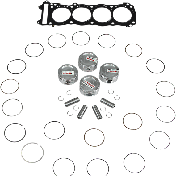 Caracteristicas: Complete engine kits include pistons, ring sets, pistons pins, retainer clips and head gasket All Wiseco pistons are forged from aerospace aluminum alloys on Wiseco's state-of-the art forging presses Built on a legacy of championships for over 60 years by American craftsmen Wiseco pistons have the latest dyno-tested technology to out-perform the competition