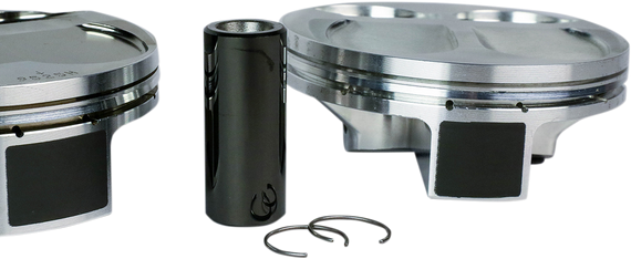 Caracteristicas: R&D developed to provide dyno-proven power gains Asymmetric skirt design for improved wear and even loading on major thrust skirt Precision fit ring; custom-lapped compression ring for improved power 100% billet machined for superior strength-to-weight ratio and optimized fit High compression (14:1 for 450cc, 14.5:1 for 250cc) for maximum torque and throttle response Dome design improves flame travel to maximize air/ fuel burn efficiency DLC-coated piston pin reduces friction and improves scuff resistance Enhanced pin oiling for improved lubrication and reduced friction Pressure seal groove reduces ring lifting and power loss ArmorGlide® skirt coating reduces friction for quieter operation, improved scuff resistance Pistons include rings, pin, and circlips