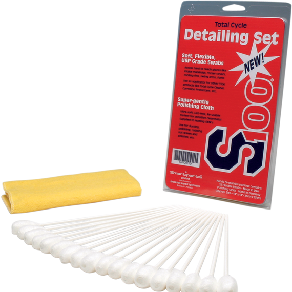 Caracteristicas: Includes 25 flexible swabs and an ultra-soft dusting and polishing cloth Swabs are great for cleaning in tight areas like cooling fins, swingarms, etc.; use swabs to apply S100 Total Cycle Cleaner or S100 Corrosion Protectant, etc. Swabs can be bent to a 90° angle to reach around corners Polishing cloth can be used for removing light dust or rubbing out polishes and waxes