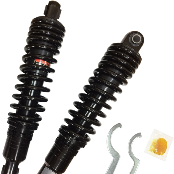Caracteristicas: Nitrogen-charged steel monotube damper bodies with hard chrome-plated shafts Dual-rate progressive wound springs for a smooth, comfortable ride Adjustable spring preload Ride-height adjustable, +/- 1/2" from size listed Black shocks feature black springs and damper bodies with black end caps/eyelets Mount with existing hardware Shocks shorter than OE length have reduced travel, this may affect the ride quality and handling of the motorcycle. Lowering the motorcycle will reduce ground and cornering clearance. Before purchasing or attempting to install shocks that are different than the OEM length, confirm that your wheel travel can be altered without causing clearance issues such as swingarm/axle to exhaust contact, as well as chain/belt guard or tire contact. OE upper shock mount covers will not fit with these shocks. Not for use with rear lowering kits.