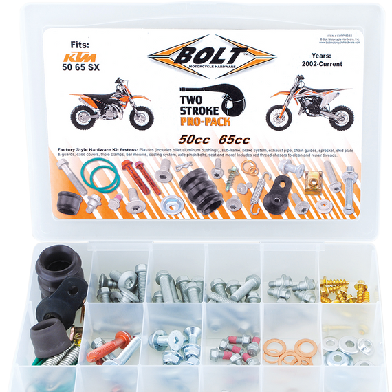 Caracteristicas: Includes over 145 pieces of M6 and M8 dimpled flange bolts, concave washers, carb screws, shroud screws, sprocket bolts, Brembo style brake pin clips, three sizes of bushings, rim-lock spacers, drain plug washers, sub-frame bolts, M5 dimpled flange bolts, and valve stem grommets The only aftermarket company to offer hardware in KTM factory-style and finish