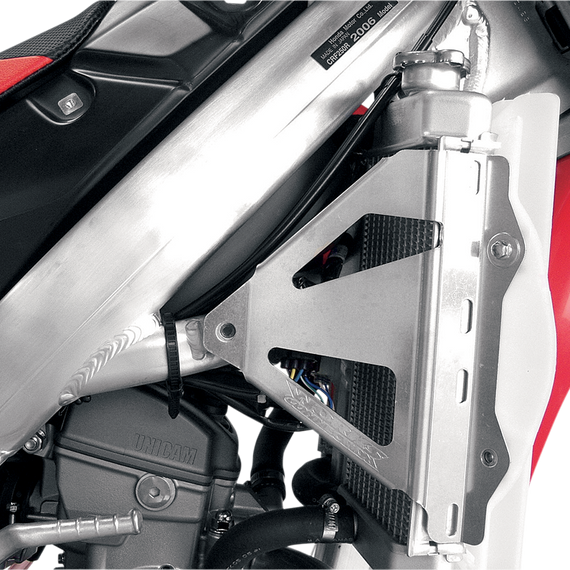 Caracteristicas: CNC-machined from aircraft grade 5052 aluminum Reinforces radiators to help prevent costly radiator replacement Lightweight, custom fit, tuck in cleanly behind radiator shrouds Simple bolt-on All necessary mounting hardware included Made in the U.S.A.