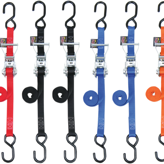 Caracteristicas: Intended for middle-weight bikes, snowmobiles, ATVs, PWC and shop equipment Industrial-grade PowerTye ratchet 4,500-lb. test nylon webbing 3/8" heavy-duty vinyl-coated hooks 700-lb. working load Double security stitching Made in the U.S.A.