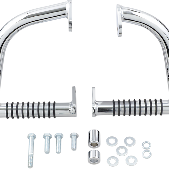 Caracteristicas: Front bars are made from 1-1/4" high-strength steel for long-lasting durability Precision bent and welded for a perfect fit every time Neoprene o-rings provide traction in all climates Rear highway bars constructed from 1" tubing; compatible with most stock exhaust systems; require removal of rear footpegs/floorboards U.S. Patent #D361311 Not recommended for use with extended forward controls or extended floorboards.