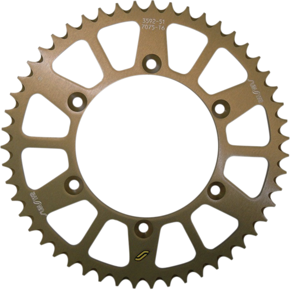 Caracteristicas: Sunstar is the largest OEM and aftermarket supplier of motorcycle and ARV sprockets in the manufacturing world for very major Japanese motorcycle builder since 1946 Constructed of high-quality, aerospace grade 7075 T-6 aluminum Computer-designed weight reduction holes for the best combination of lightness, strength, and stability Exclusive tooth-valley design provides 50% better chain contact area for the best power transfer possible Hard anodized coating for added durability and a superb finish Cleaning grooves added at the bottom of tooth area