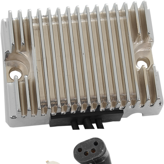 Caracteristicas: High-reliability voltage regulators feature rugged aluminum alloy construction and are available in Drag's chrome finish All provide accurately regulated voltage under all electrical loads, have no relay contacts to wear or become maladjusted and are environmentally sealed for protection against moisture and shock