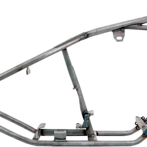 Caracteristicas: Constructed of 1-1/4" DOM steel tubing, mandrel bent, TIG and MIG welded 30° rake, 0" stretch Designed for 4, 5, and 6-speed transmissions; transmission plate sold separately Accepts Evolution motors; clearance for cylinders up to .200" taller than stock Uses stock 86-99 Softail oil tank and rear brake caliper (sold separately) Gas tank mounts, rear axle, exhaust bracket, belt guard tabs, and coil bungs sold separately Made in the U.S.A.