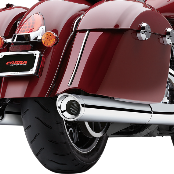 Caracteristicas: Designed and built specifically for the Indian Chief, Chieftain, and Roadmaster Starting with a chromed 4" muffler body and ending with a chrome billet aluminum scalloped tip, these mufflers are the perfect addition to your classic looking Indian Muffler bodies consists of 2.5" perforated constant velocity cores, wrapped in woven fiberglass that is protected by a fiberglass wrap; This provides outstanding performance with a deep thundering bass note that nobody else can match