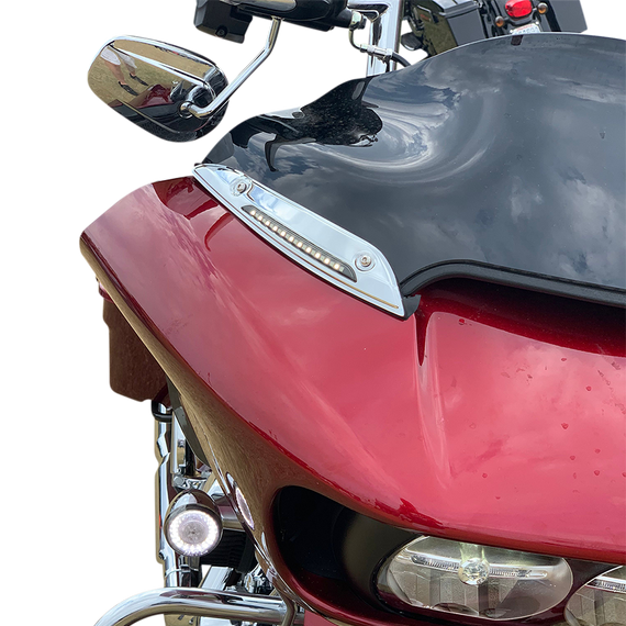 • Bolts on to the stock Road Glide fairing to increase forward and side visibility with built in white DRL running light and sequential amber turn signals behind a smoked lens