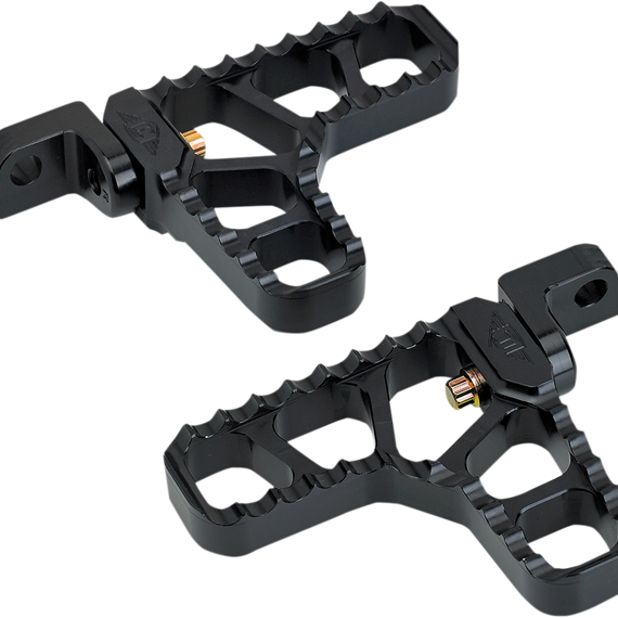 Caracteristicas: Give your bike a unique design twist with these all-billet aluminum adjustable serrated footpegs Fully CNC-machined from solid 6061 T-6 bar Super strong, yet lightweight two-piece construction The comfortable serrated foot surface area provides a good "bite" onto the bottom of your shoe Feature full 360° footpeg rotation making them perfect for any application Made in the U.S.A.