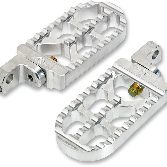 Caracteristicas: Give your bike a unique design twist with these all-billet aluminum adjustable serrated footpegs Fully CNC-machined from solid 6061 T-6 bar Super strong, yet lightweight two-piece construction The comfortable serrated foot surface area provides a good "bite" onto the bottom of your shoe Feature full 360° footpeg rotation making them perfect for any application Made in the U.S.A.