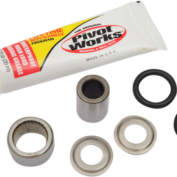 Caracteristicas: Kit contains two PTFE spherical bearings (cup bearings when used), four seals and related components Each shock kit rebuilds both ends of the shock absorber Some shock absorbers on Kawasaki and Honda models use a clevis to connect shock to the linkage. The bearing, collar and seals that are pressed into the linkage arm are included in the Pivot Works Shock Kit.