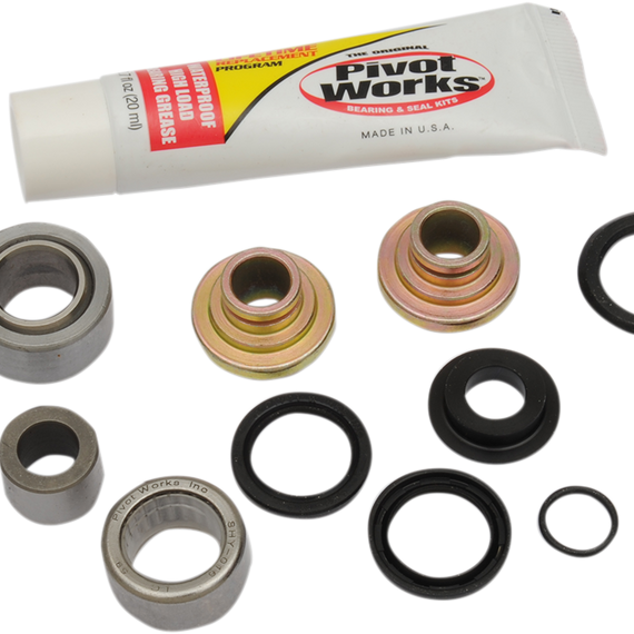 Caracteristicas: Kit contains two PTFE spherical bearings (cup bearings when used), four seals and related components Each shock kit rebuilds both ends of the shock absorber Some shock absorbers on Kawasaki and Honda models use a clevis to connect shock to the linkage. The bearing, collar and seals that are pressed into the linkage arm are included in the Pivot Works Shock Kit.