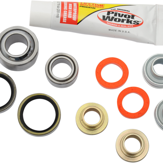 Caracteristicas: Kit contains two PTFE spherical bearings (cup bearings when used), four seals and related components Each shock kit rebuilds both ends of the shock absorber Some shock absorbers on Kawasaki and Honda models use a clevis to connect shock to the linkage. The bearing, collar and seals that are pressed into the linkage arm are included in the Pivot Works Shock Kit.