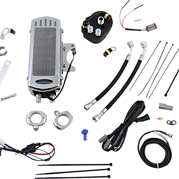 Caracteristicas: Sealed waterproof IP68 fans produce 220 CFM of airflow Oil adapter and thermal switch automatically turns on the dual fans when your oil reaches 210¶øF Specially designed aluminum heat exchanger with turbulators for maximum heat dissipation Plug-and-play wiring harness with relay and waterproof connectors that all connects to the battery under the seat for simple installation Black nylon coated stainless steel braided oil lines with AN6 fittings Optional LED indicator light indicates when the fans are operating (toggle or clamp handlebar LED mounts sold separately) Specially designed oil line fitting wrench Has the ability to drop your oil temperature up to 50¶øF Complete kit; ready to install Will not fit with water-cooled heads
