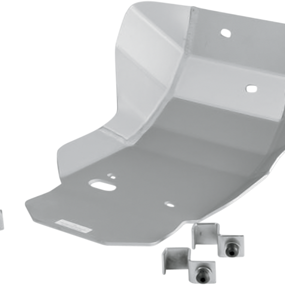 Caracteristicas: Protect vital engine parts and cases from rocks and debris Clear anodized for corrosion protection and good looks Skid plates made from 3/16" 5052 H-32 aluminum Smooth underside won't snag when crossing logs Oil drain hole on all required models Heat-treated chromoly steel clamps keep plates mounted securely All mounting hardware included Made in the U.S.A.