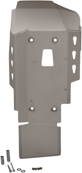Caracteristicas: Protect vital engine parts and cases from rocks and debris Clear anodized for corrosion protection and good looks Skid plates made from 3/16" 5052 H-32 aluminum Smooth underside won't snag when crossing logs Oil drain hole on all required models Heat-treated chromoly steel clamps keep plates mounted securely All mounting hardware included Made in the U.S.A.
