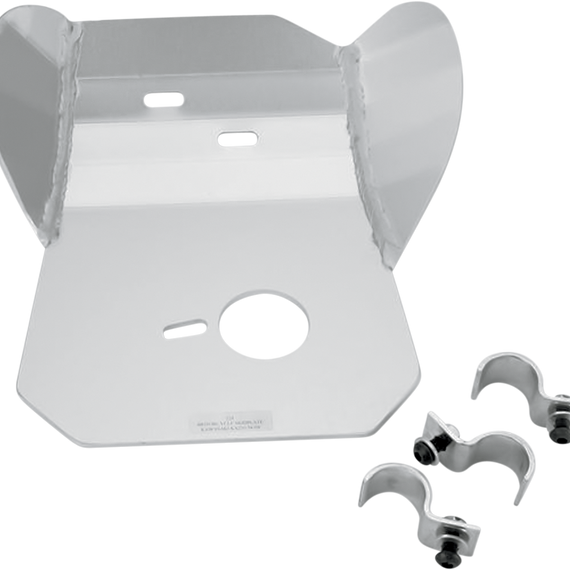 Caracteristicas: Protect vital engine parts and cases from rocks and debris Clear anodized for corrosion protection and good looks Skid plates made from 3/16" 5052 H-32 aluminum Smooth underside won't snag when crossing logs Oil drain hole on all required models Heat-treated chromoly steel clamps keep plates mounted securely All mounting hardware included Made in the U.S.A.