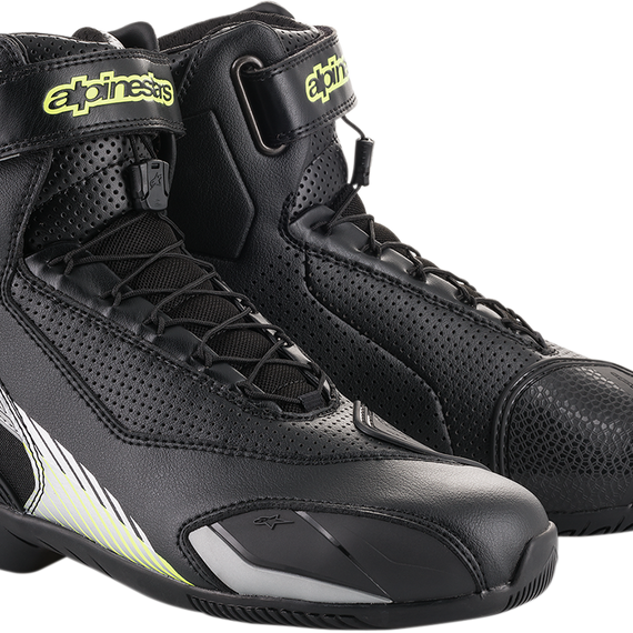 Caracteristicas: Microfiber upper Perforated microfiber panels on lateral and medial quarter areas plus medial side perforation zone for enhanced airflow Tongue is made with breathable mesh to improve airflow Rear accordion panel is lightweight padded material Speed lacing system derived from Alpinestars MotoGP technology for a quick, precise, secure closure Ankle opening closure system using a hook-and-loop strap with debossed Alpinestars logo Foam-backed double-density ankle disc guards mounted under the upper boot layer Thermoplastic Rubber (TPR) guards in key areas for impact resistance and flexibility External TPR toe reinforcement for abrasion resistance Welded reflective insert on rear improves visibility in low-light conditions Thermoplastic Polyurethane (TPU) heel counter guards against impacts and abrasion Internal toe box reinforcement layered under the shoe microfiber outer layer Breathable textile lining with anti-sliding microfiber suede at the heel Removable anatomical EVA foam footbed Vulcanized rubber sole compound