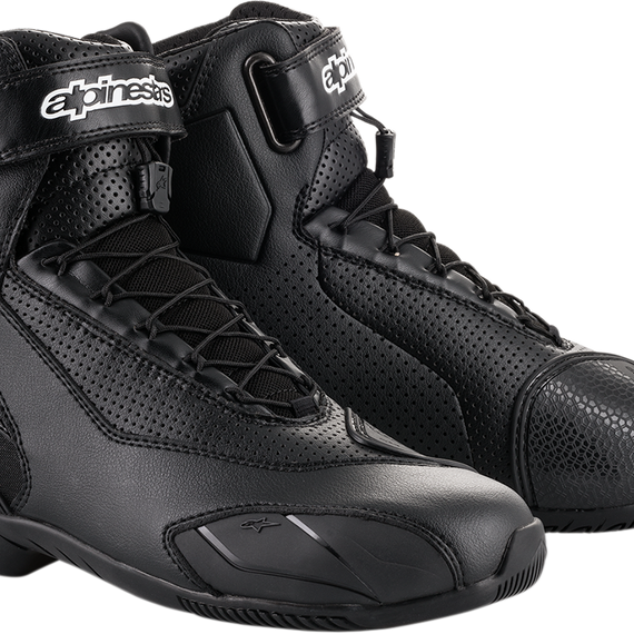 Caracteristicas: Microfiber upper Perforated microfiber panels on lateral and medial quarter areas plus medial side perforation zone for enhanced airflow Tongue is made with breathable mesh to improve airflow Rear accordion panel is lightweight padded material Speed lacing system derived from Alpinestars MotoGP technology for a quick, precise, secure closure Ankle opening closure system using a hook-and-loop strap with debossed Alpinestars logo Foam-backed double-density ankle disc guards mounted under the upper boot layer Thermoplastic Rubber (TPR) guards in key areas for impact resistance and flexibility External TPR toe reinforcement for abrasion resistance Welded reflective insert on rear improves visibility in low-light conditions Thermoplastic Polyurethane (TPU) heel counter guards against impacts and abrasion Internal toe box reinforcement layered under the shoe microfiber outer layer Breathable textile lining with anti-sliding microfiber suede at the heel Removable anatomical EVA foam footbed Vulcanized rubber sole compound