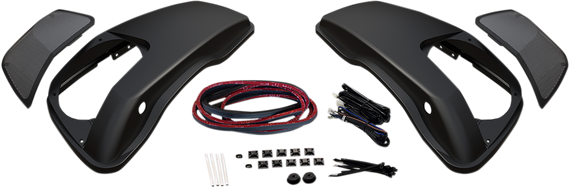 Caracteristicas: Kit includes High-Impact ABS replacement saddlebag lids, lid tethers, grilles, grommets, wire harness and required hardware Disassembles easily for paint Accepts OEM and aftermarket latches Required amplifier and optional speakers are not included.