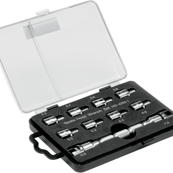 Caracteristicas: Spoke wrench kit includes all popular sizes Features 10 heads in sizes 5.2 mm through 7 mm, with handle and storage case Works for almost any application