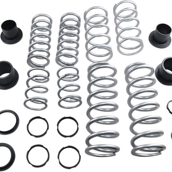 Caracteristicas: All systems include springs, sliders, stop rings and complete setup instructions Race-proven durability and quality Engineered and tested by drivers For 2- and 4-seat vehicles with higher loads and multiple passengers More aggressive spring rates keep the machine balanced Adjustable shock lockout collars included to allow fine-tuning of the transition point of the dual-spring setup Improves turn-in response and better power hookup out of the turns Smoother ride over rough terrain Stiffer spring rates prevent bottoming in the G-outs Made in the U.S.A.