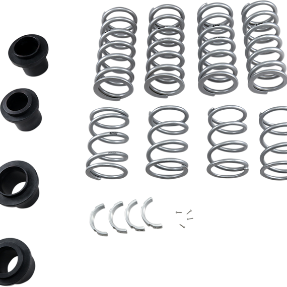 Caracteristicas: All systems include springs, sliders, stop rings and complete setup instructions Race-proven durability and quality Engineered and tested by drivers For 2- and 4-seat vehicles with higher loads and multiple passengers More aggressive spring rates keep the machine balanced Adjustable shock lockout collars included to allow fine-tuning of the transition point of the dual-spring setup Improves turn-in response and better power hookup out of the turns Smoother ride over rough terrain Stiffer spring rates prevent bottoming in the G-outs Made in the U.S.A.