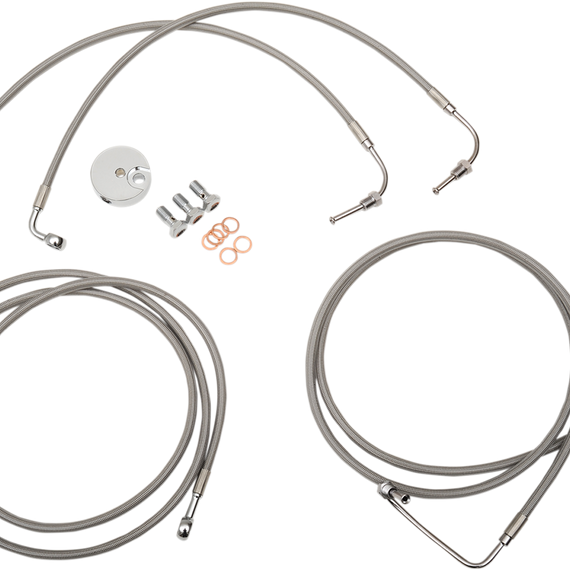 Caracteristicas: Take "cable calculation" headaches out of swapping handlebars Stainless braided kits include throttle cable, idle cable (except 08-16 Dressers), clutch cable/clutch line, brake lines, chrome "T" brake line junction, banjo bolts, fittings and copper crush washers Black vinyl/stainless kits include black vinyl throttle and idle cables (except 08-16 Dressers), black vinyl clutch cable/clutch line and black stainless brake lines with chrome fittings, banjo bolts and crush washers The midnight kits include stainless steel brakes, cables and lines covered in a black smoke tinted coating with pure black fittings throughout; lines appear graphite or carbon fiber in appearance providing that ultra custom look and the black fittings seamlessly blend with blacked out controls and covers on the bike Made in the U.S.A.