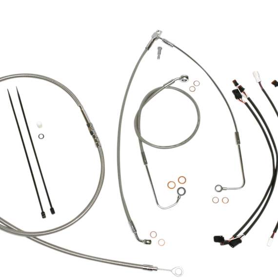 Caracteristicas: Magnum XR Handlebar Installation Kits offer a great fit and excellent quality at an economical price Kit features highly polished, chrome plated fittings All cables are a low effort, high efficiency design that meets or exceeds all OE specifications for fitment, construction, endurance Magnum XR Brake Lines use an enhanced construction of heavy gauge stainless steel embedded in tough abrasion resistant nylon outer jacket for superior durability and extreme braking response for safe riding The coating on cables and brake lines offers exceptional protection for paint or chrome Kits that include manifolds use an all brazed construction to ensure optimal OE fitment and appearance Manifolds use -3 AN connections for an easy installation Kits include throttle and idle cables or throttle-by-wire extensions, clutch cable or XR hydraulic clutch line, XR brake lines, copper crush washers, hardware, turn signal and switch wiring extensions Kits are based on using ape hanger style handlebars and 2" risers.