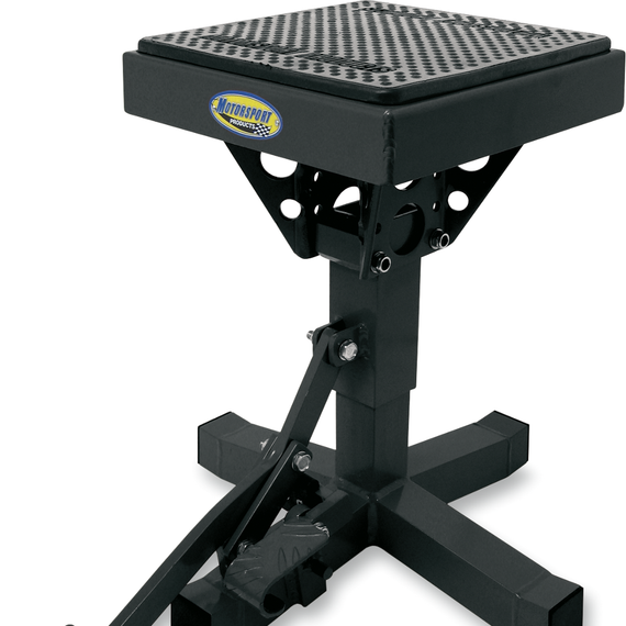 Caracteristicas: Easily lifts bikes by stepping on foot lever so even youth riders can put their own bike on this stand Rubber top with embossed logo and raised bumpy non-slip surface Large heavy-duty top lifts both wheels off the ground Foot-activated release trigger with nylon slider block Leg stance is 16" wide for maximum stability Large recessed rivets won't break off Designed for dirt bikes from 50-650cc