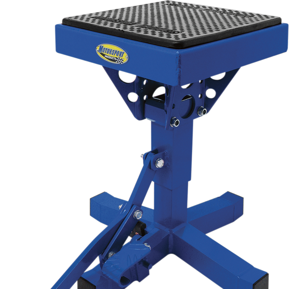 Caracteristicas: Easily lifts bikes by stepping on foot lever so even youth riders can put their own bike on this stand Rubber top with embossed logo and raised bumpy non-slip surface Large heavy-duty top lifts both wheels off the ground Foot-activated release trigger with nylon slider block Leg stance is 16" wide for maximum stability Large recessed rivets won't break off Designed for dirt bikes from 50-650cc