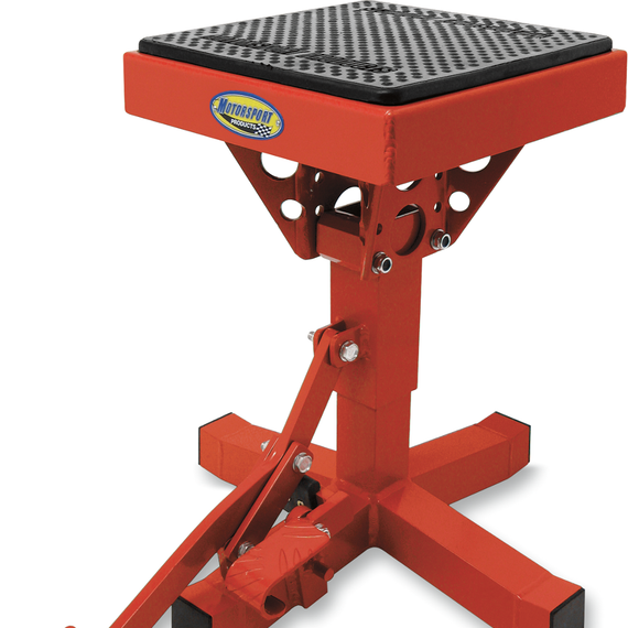 Caracteristicas: Easily lifts bikes by stepping on foot lever so even youth riders can put their own bike on this stand Rubber top with embossed logo and raised bumpy non-slip surface Large heavy-duty top lifts both wheels off the ground Foot-activated release trigger with nylon slider block Leg stance is 16" wide for maximum stability Large recessed rivets won't break off Designed for dirt bikes from 50-650cc