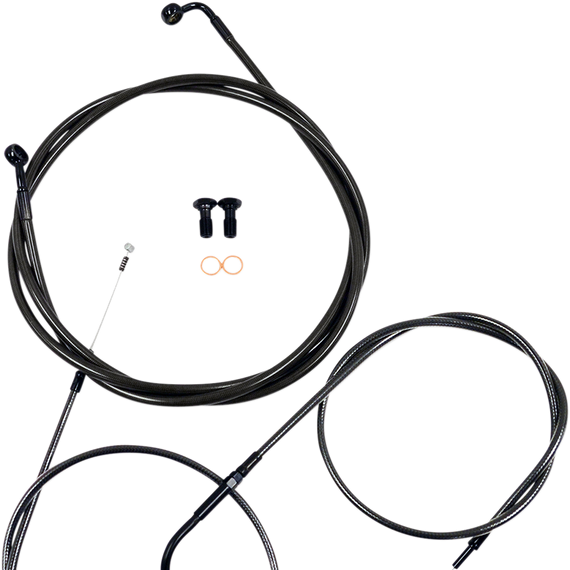 Caracteristicas: Standard kits include clutch line, brake lines, black "T" brake line junction, banjo bolts, fittings and copper crush washers Standard kits include the correct length brake/clutch lines and wire extensions to complete a handlebar swap Electrical wire extensions NOT included (available separately) Midnight series kits include clutch line and brake lines covered in a black smoke tinted coating with pure black fittings throughout Lines appear graphite or carbon fiber in appearance providing that ultra custom look and the black fittings seamlessly blend with blacked out controls and covers on the bike Made in the U.S.A. Kits are based on using 2" risers with Ape Hanger handlebars