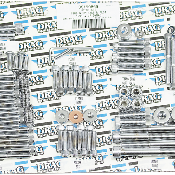Caracteristicas: Socket-head bolt sets to meet virtually any custom need Complete motor sets for 07 and later Big Twin include bolts for primary, cam, cam sensor, derby, rocker box, transmission top, transmission side, lifter block and clutch covers Complete motor sets for 87-94 Big Twin include bolts for cam, primary, point, clutch, inspection and chain covers, lifter base, inner primary, top front and rear motor mounts, timing plug and header mount screws Complete motor sets for 04 and later XL include bolts for primary, cam, derby, lifter block, points cover, rocker box and engine case Complete motor sets for 86-03 XL include bolts for cam, primary, generator, sprocket, rocker box, top motor mount, lifter base, point or magneto cover Made in the U.S.A.