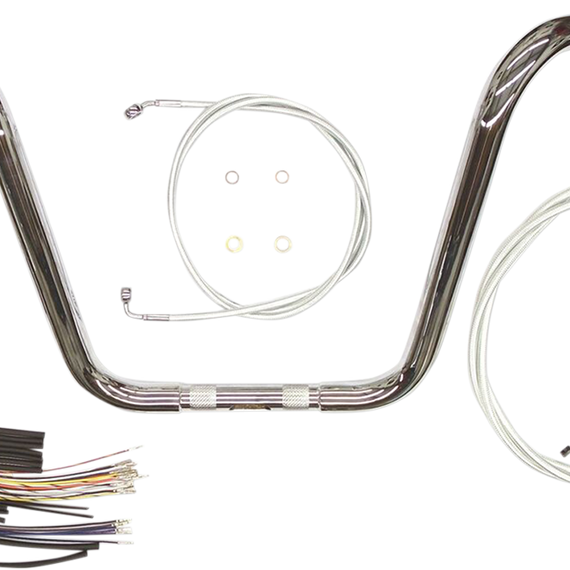 Caracteristicas: The only complete Handlebar Kits with matching braided cables and brake lines that include Magnum Caliber Handlebars Magnum 1-1/4" Caliber handlebars are manufactured with the highest quality construction, including machined control mounts (not swaged) and feature high luster finish for an unsurpassed appearance All handlebars are 1-1/4" diameter with 1" diameter center section and 3-1/2" on-center knurling, work with standard controls, including hydraulic clutch, and are machined for internal wiring and electric throttle control All Caliber Handlebars are preloaded with E-Z pull-thru sleeving to make wiring installations a breeze Kits include: Magnum 1-1/4" Caliber Handlebars, throttle and idle cables or throttle-by-wire extensions, a clutch cable or hydraulic clutch line, brake lines, copper crush washers, hardware, and any necessary switch wiring or turn signal extensions All cables are a low effort, high efficiency design that meets or exceeds all OE specifications for fitment, construction, endurance Kits for dual disc models include an all brazed manifold that eliminates leaks, alignment problems, and unattractive threaded connections Brake lines exceed all DOT FMVSS-106 requirements Assembled in the U.S.A. Caliber Handlebars have a 1" diameter center section and fit 1" risers. Models originally equipped with handlebars that have a center section diameter larger than 1" will require changing the risers to a 1" ID version. Examples would be, but not limited to FLSTF, FLSTFB and CVO models. Please check before ordering.